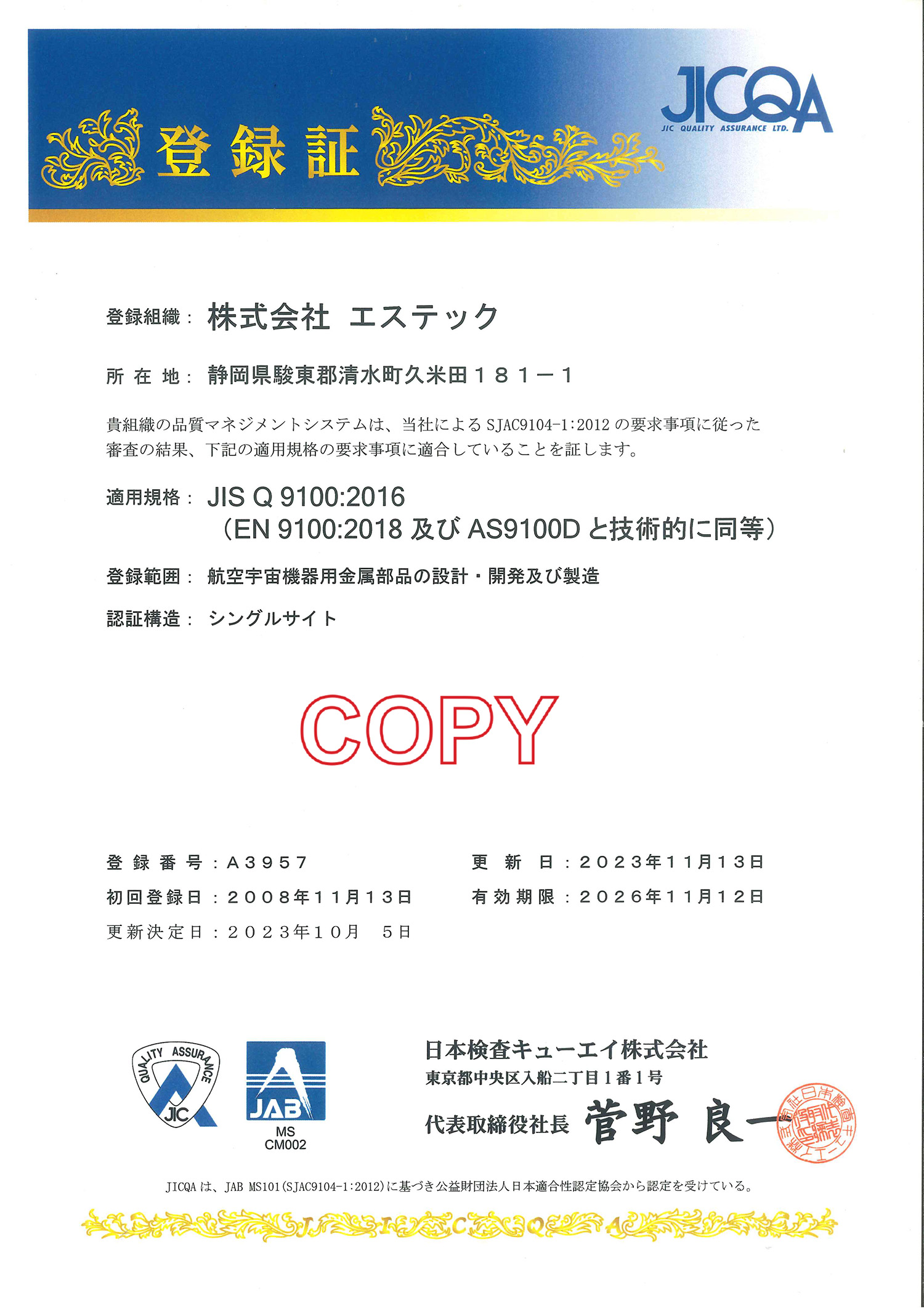 当社の製作する部品は重要な部品であり、Nadcap認証・取得に裏付けられた確かな品質管理を行うことで、一層のお客様満足の実現に努めます。